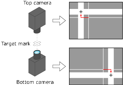 This mechanism first performs pattern matching using both the top camera and bottom camera with respect to the same target mark to detect each camera’s deviation from the target mark. By feeding back this deviation when alignment for mounting is performed, the deviation of the camera position is offset.
