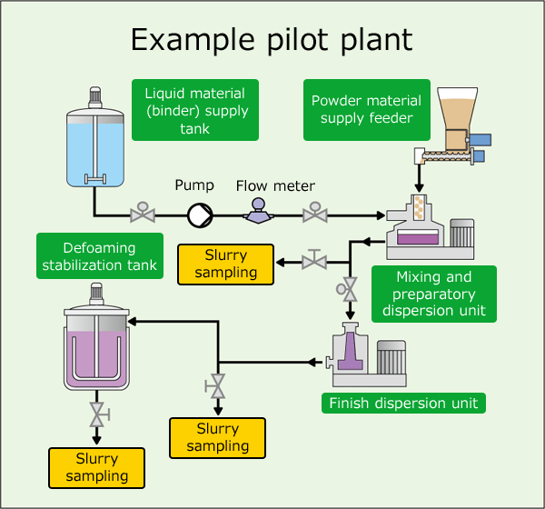 This system is for producing electrode slurry for lithium-ion batteries (LiB) by continuously performing processes starting from the mixing of powder and liquid LiB materials through to final dispersion. In the preparatory dispersion process, stable solid-liquid mixing of small high-density conductive agents is possible, and since production is done continuously, manufacture in small quantities is possible with no need for batch quantities.