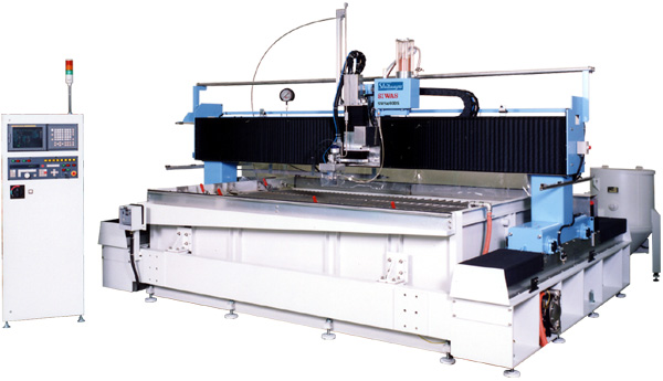 This water jet cutting machine is an open catcher type suited for high-speed and high-accuracy cutting with sheets for cutting fixed in place.