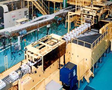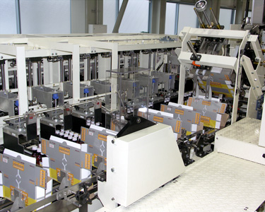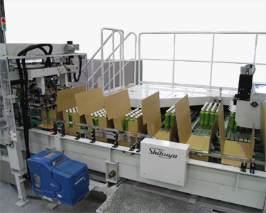 - In the case of an emergency stop, cases already in the gluing and sealing section continue to be glued and sealed as the hot melt gun and sealing unit automatically complete the process, minimizing the occurrence of partially glued or unglued cases.
